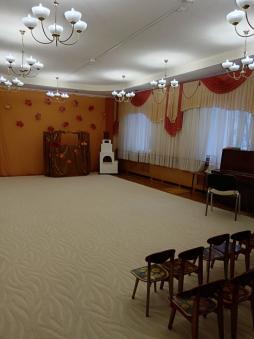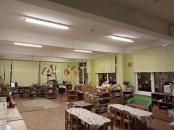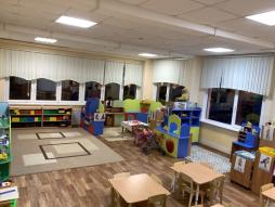 Детский стол и стулья, зеркало, ковролинограф, магнитная доска, стеллажи для пособий.
